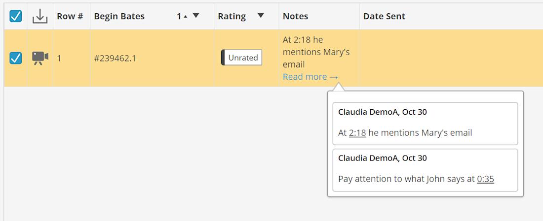 Reviewing attorneys could search the transcripts for phrases included in the request for production. Responsive passages could be highlighted, allowing attorneys to focus their attention on that section of the video transcript. Notes can be added to specific timestamps to identify important passages.